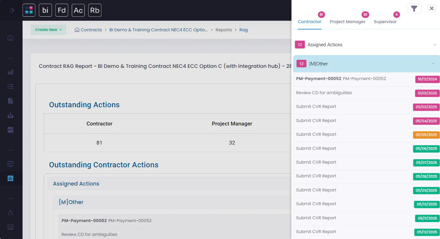 Some systems offer built-in reporting through tools like Power BI, which lets you visualise and interrogate contract performance across your projects. FastDraft, for example, uses Power BI reporting to allow users to drill down on single projects, or expand their analysis across their entire portfolio. For organisations managing multiple projects, FastDraft also offers professional services such as health check reporting, benchmarking, and the creation of tailored reports across the 60+ KPIs the reporting system tracks, allowing you to resolve any operational inefficiencies based on targeted data.